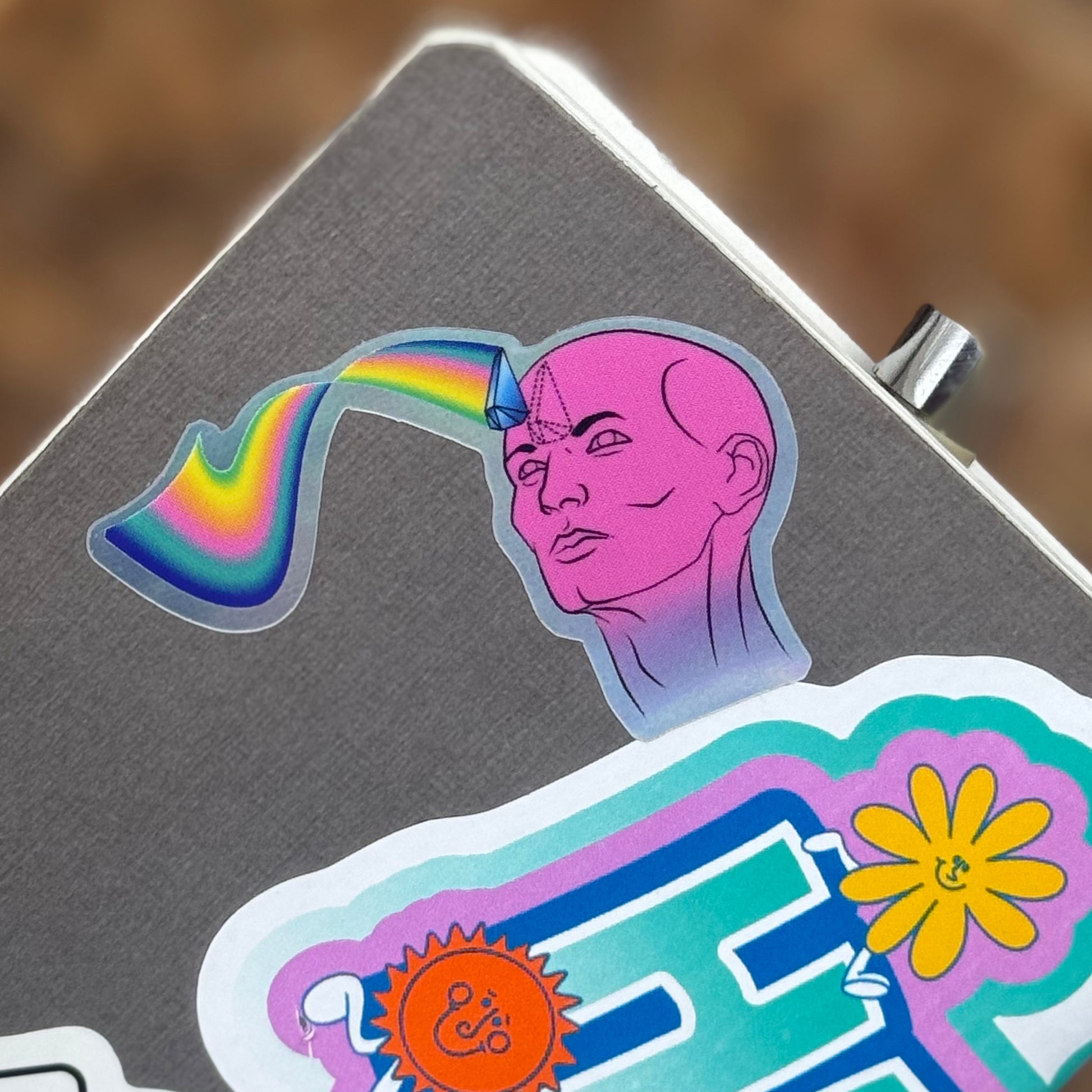 Holographic sticker showing your favorite pink man with a psychic forehead crystal.